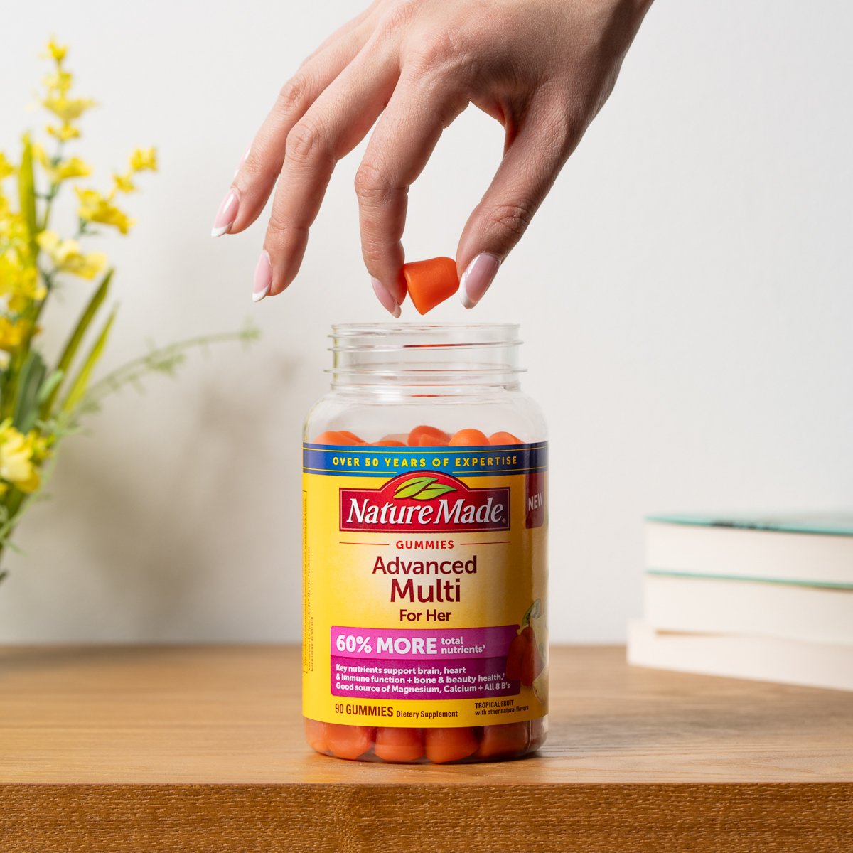 Nature Made® Advanced Multi for Her Gummies provide 20 key nutrients for daily nutritional support—now with 60% more total nutrients◆ in gummy form. Plus, you’ll get a good source of High Absorption Magnesium Citrate to support muscle relaxation and nerve, heart and bone health, Calcium to help support strong bones, and an excellent source of all 8 B Vitamins to support brain function including Biotin to support healthy hair and skin. All that comes in 3 daily gummies that are easy to take and enjoyable!†