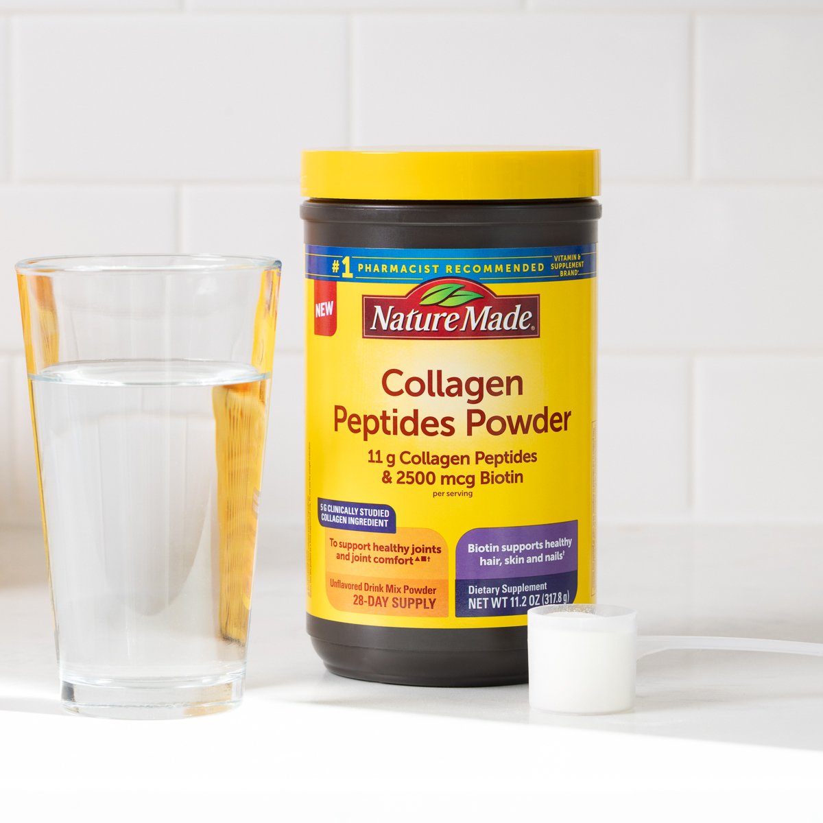 Nature Made® Collagen Peptides Powder is an unflavored drink mix powder with 11 g of a Collagen Peptides Blend per serving. One level scoop includes 5 g of a clinically studied Collagen ingredient to support healthy joints and joint comfort▴▪️, and 2500 mcg Biotin to support healthy hair, skin, and nails. To enjoy, simply mix one level scoop into 4-6 oz of water or your favorite beverage, preferably room temperature or warm. On top of providing ingredients for your joints, hair, skin & nails, this Collagen powder is gluten free, sugar free◆, and keto friendly‡ with no dairy and no soy.†