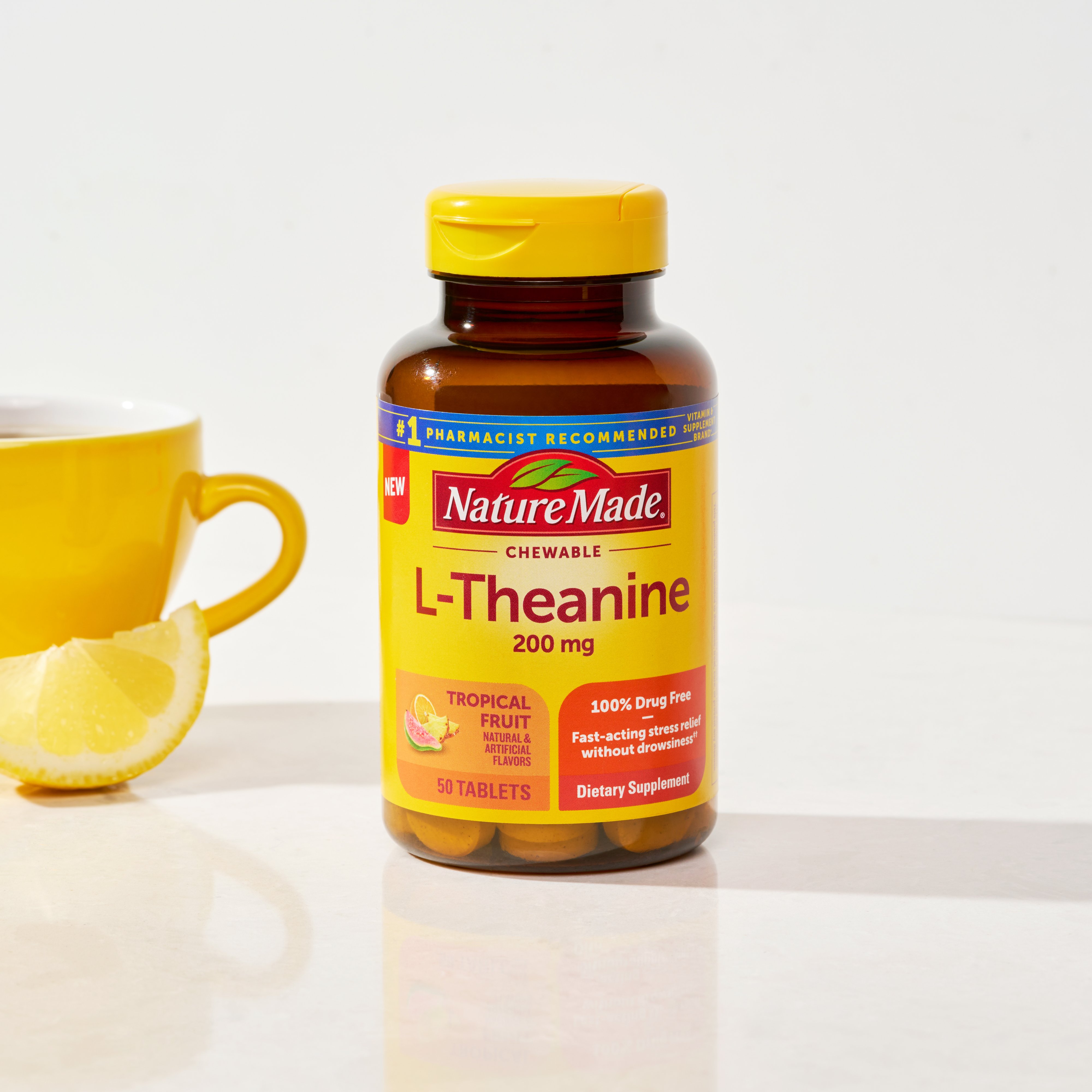 Get fast-acting stress relief without drowsiness with Nature Made® L-Theanine 200 mg. One tasty chewable tablet helps relax the mind and works within 30 minutes.