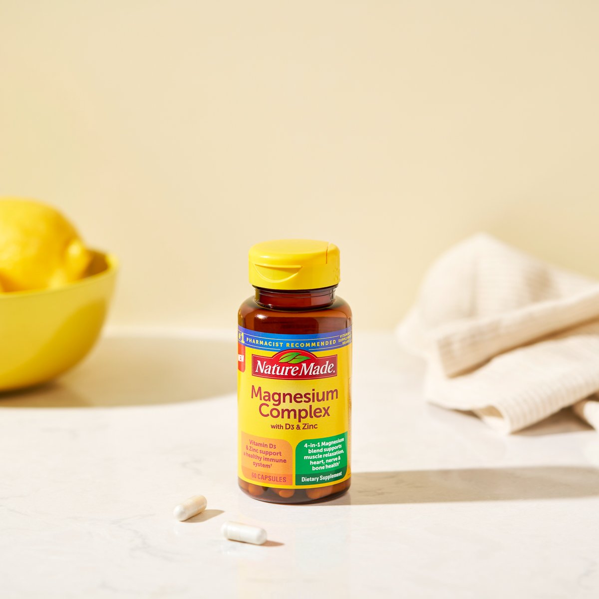 Nature Made® Magnesium Complex with D3 and Zinc provides 230 mg of an essential mineral blend of Magnesium Oxide, Magnesium Citrate, Magnesium Glycinate, and Magnesium Malate to support muscle relaxation and nerve, bone and heart health, plus Vitamin D3 1200 IU (30 mcg) and Zinc 10.5 mg to support a healthy immune system in two daily capsules.†