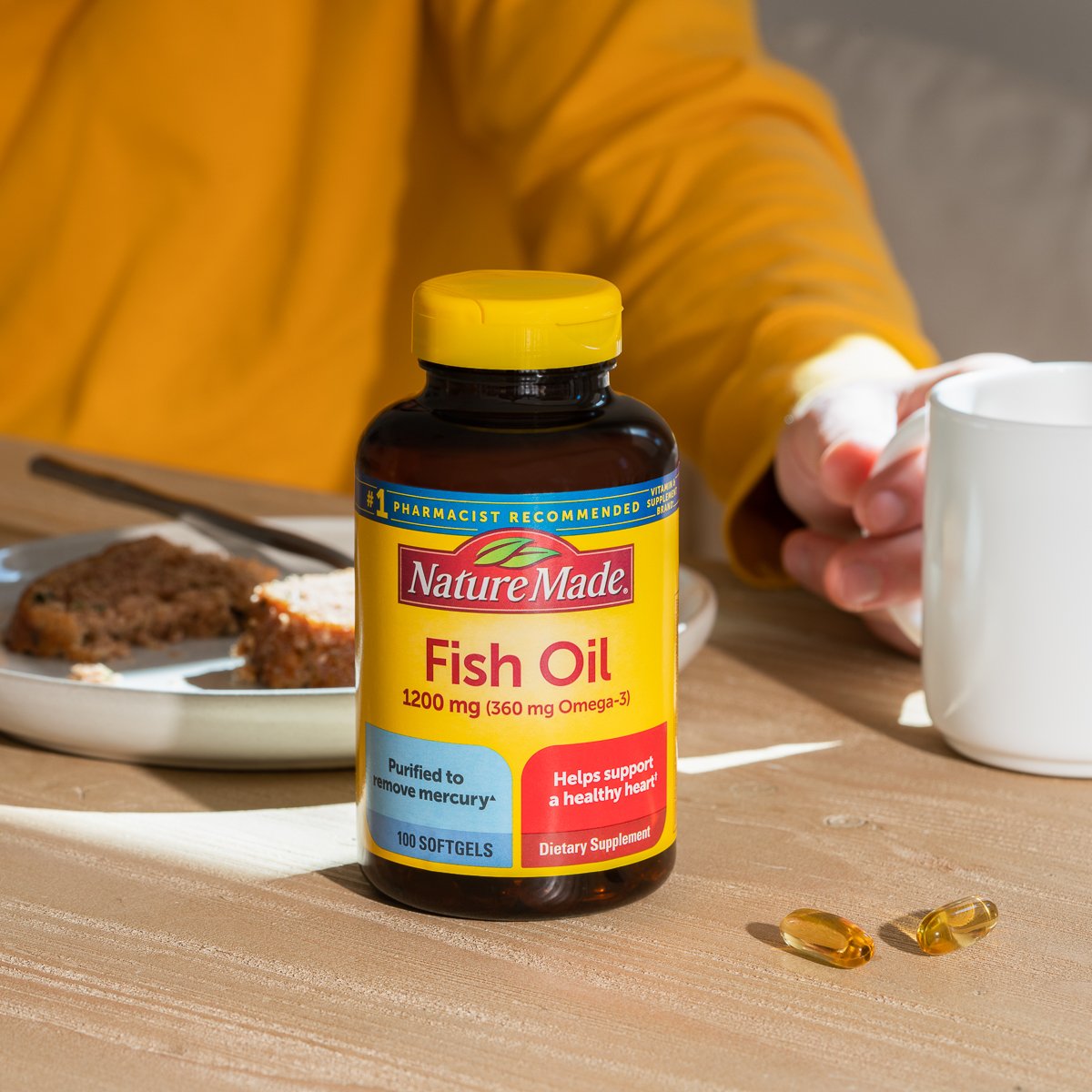 Nature Made® Fish Oil provides 1200 mg (360 mg Omega-3) per softgel for a total of 2400 mg (720 mg Omega-3) per daily serving. The Omega-3s (EPA and DHA) in fish oil help support a healthy heart.