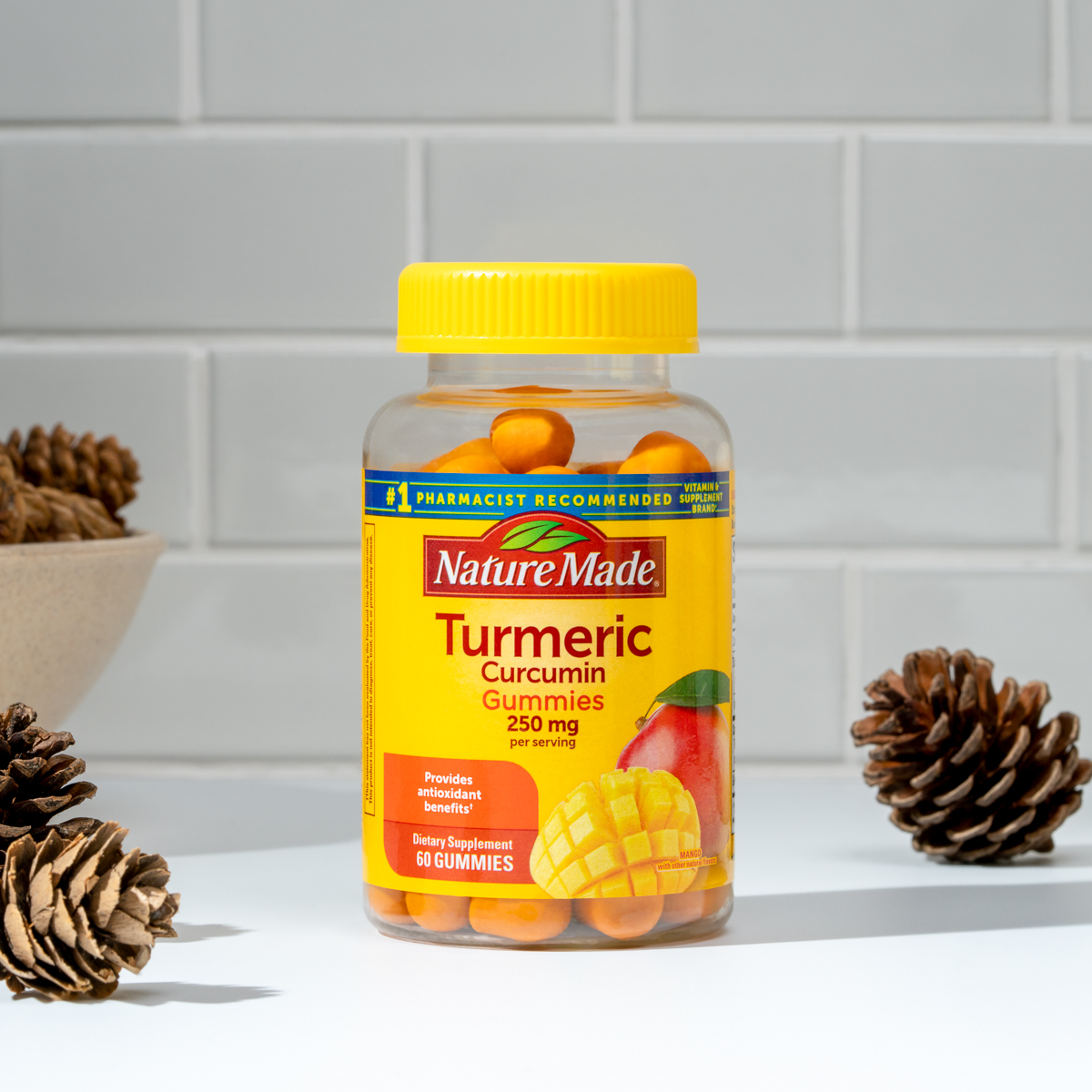 Made from the roots of the Curcuma longa plant, turmeric is an Indian spice that’s become a popular herbal supplement due to its antioxidant benefits. † The curcumin in turmeric is responsible for its vibrant yellow color and provides antioxidant activity that helps neutralize free radicals in the body. † Out of various common spices, turmeric has one of the highest antioxidant activities because of its active curcuminoids. † Nature Made Turmeric Curcumin Gummies are formulated with Curcumin C3 Complex®Turmeric Root Extract, which is standardized to 95% curcuminoids. * Standardization is a process by the manufacturer to ensure consistency and potency of the product. Experience the benefits of this herbal supplement for yourself, with our delicious Turmeric Curcumin gummies. †