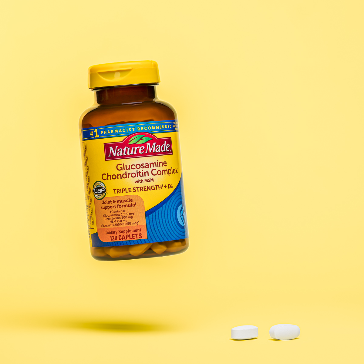 Nature Made® Glucosamine Chondroitin with MSM (popularly known as Triple Flex®) plus D3 is a joint and muscle support formula. Our Triple Strength formula contains 1500 mg of Glucosamine to help support healthy cartilage and 800 mg of Chondroitin to help keep your joints moving smoothly by helping to support joint cushioning, with 750 mg of MSM, which is a source of dietary sulfur, a trace element used by the body in collagen, connective tissue, and joint cartilage. This dietary supplement also includes 50 mcg (2000 IU) of Vitamin D3 to support bone, teeth, and muscle health.†