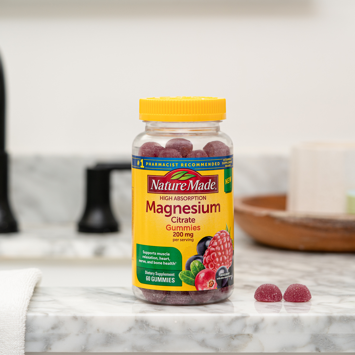 Nature Made® Magnesium Citrate Gummies offer a delicious way to add some Magnesium to your diet. This mineral supports essential nerve, muscle and heart function, helps convert food into cellular energy, and helps relax the body. Plus, Magnesium Citrate is better absorbed than Magnesium Oxide. Each serving (2 gummies) provides 200mg of Magnesium to help support muscle relaxation, heart, nerve and bone health.†